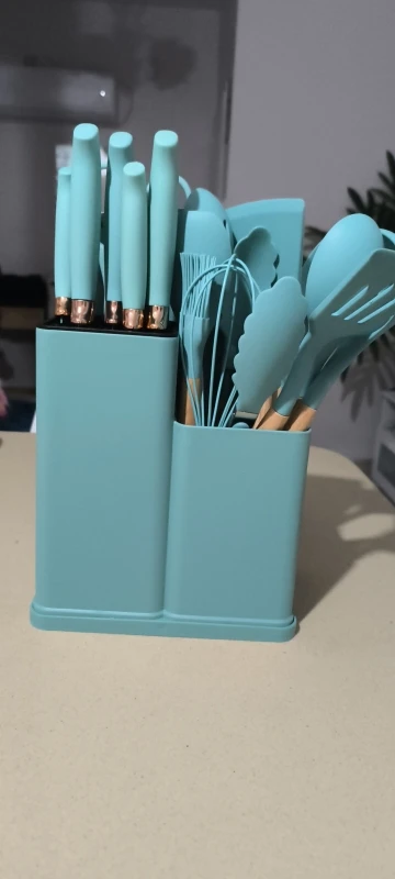 Includes:Ā Chef knife, slicing knife, bread knife, utility knife, fruit knife, spatula, deep soup ladle, colander, pasta spoon, scraper, food tongs & chopping board.